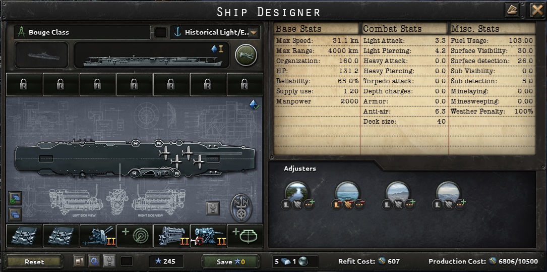 The Bouge class is the first ship I design as it does not require any additional research to put together. I make two of these for providing air superiority and CAS support for naval invasions. The loadout for them is two wings of fighters and two wings of mutli role CAS/naval bombers.