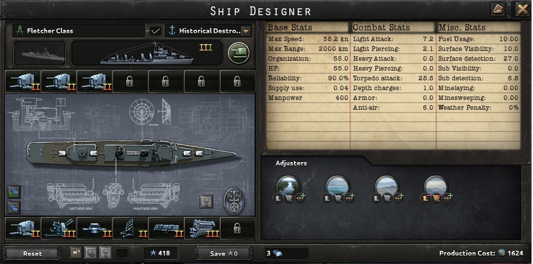 The US starts off with a powerful navy. Adding three more of the pre-designed Yorktown class carriers will give you the basis for two very powerful strike forces. I usually also build a couple of cruiser deck conversion light carriers for invasion support. But the vast majority of my naval production is focused into Destroyers and Light Cruisers. These ships are designed to take advantage of the fact that the higher a ship's speed and the lower its surface visibility, the harder it is to hit. |